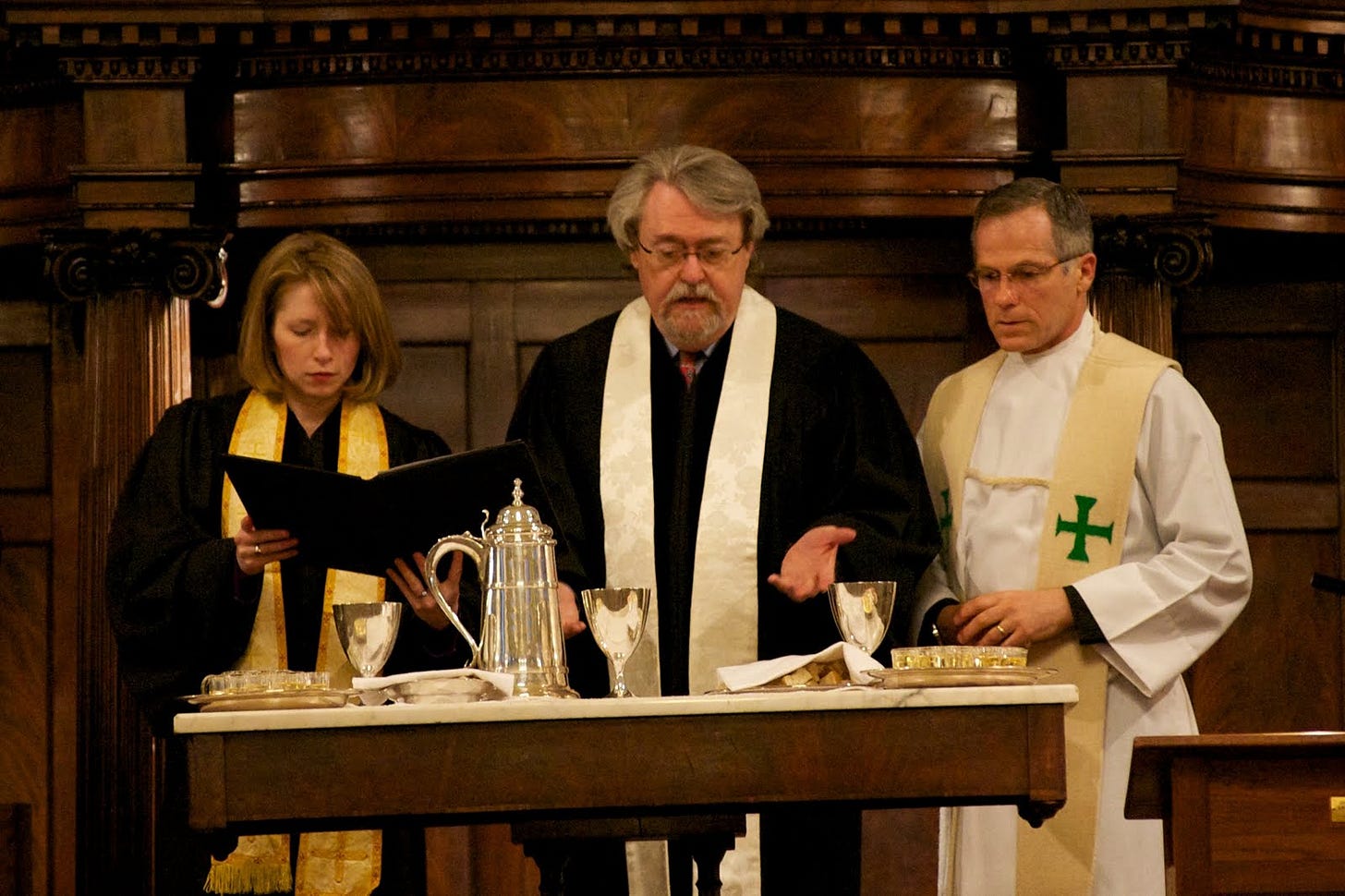 The image is the author and two colleagues celebrating communion at the First Unitarian Church in Providence, Rhode Island.