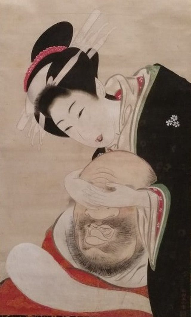 A woman blindfolds Bodhidharma, Ishida Guokuzan, late Edo period (early 19th to early 20th century